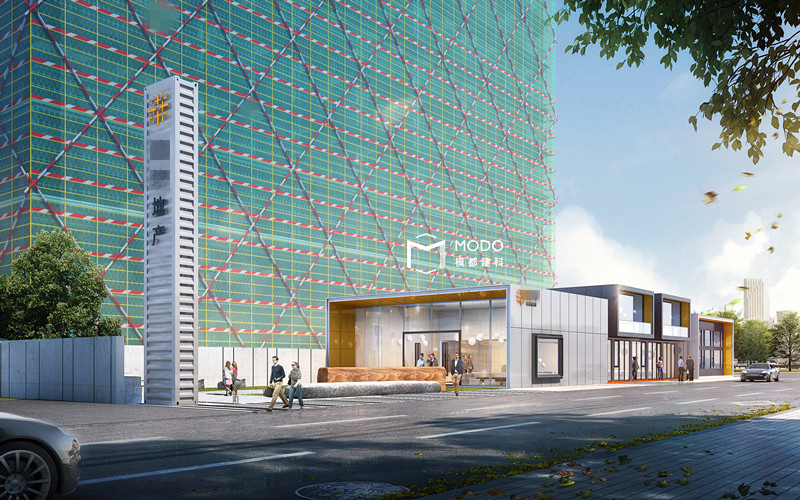 臨時售樓部采用定制集裝箱的模式建造,由預(yù)制化的集裝箱作為支持構(gòu)建,配以裝配式的外立面和內(nèi)裝。建筑分為精神堡壘(樓梯間)接待區(qū)、沙盤展示區(qū)、水吧區(qū)、衛(wèi)生間、洽談區(qū)、辦公室、倉庫等主要功能區(qū),各區(qū)域具有既相互融合又互相獨立,可分可合。根據(jù)功能需要,建筑各部分高度不同。
